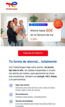 TotalEnergies: continúan los descuentos del Black Friday, con ahorro de hasta 60 € para nuevos clientes, sin permanencia y con plan de atención personalizada.