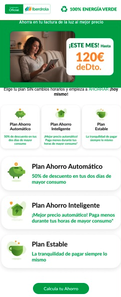 Iberdrola: plan Ahorro Inteligente con tarifa estable y sin sorpresas. Este mes, además, disfruta del código descuento ENERGY XMAS para ahorrar hasta 120 €. ¡Solo hasta el 31 de diciembre!