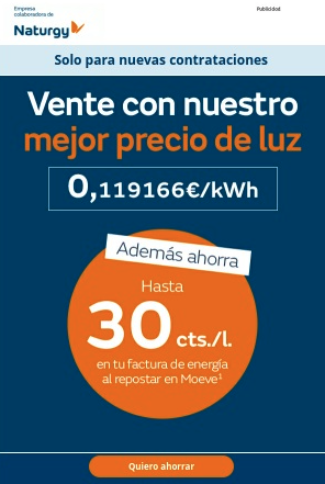 Naturgy: tarifa de luz a 0,11 €/kWh y, para nuevas contrataciones, 30 céntimos de descuento por litro al repostar en Moeve.