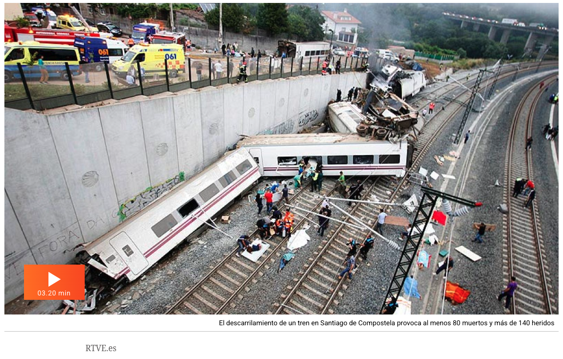 El accidente ferroviario de Santiago de Compostela ocurrió el 24 de julio de 2013, cuando un tren Alvia que cubría la ruta Madrid-Ferrol descarriló en la curva de Angrois, a las afueras de Santiago de Compostela, en Galicia.