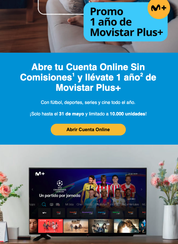- Promociones especiales: hasta 1 año de Movistar Plus+ por abrir cuenta y realizar pasos simples como activar Bizum y hacer tres pagos con tarjeta.