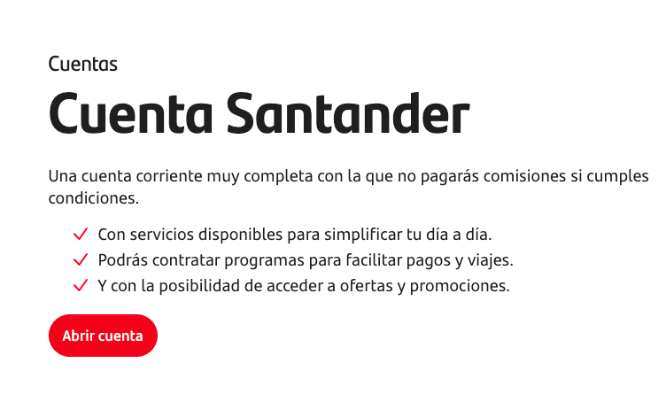 | Banco Santander | Rentabilidad variable / baja en cuentas tradicionales; bonificaciones promocionales | Sin comisiones si se cumplen condiciones de vinculación | Plataforma online + amplia red de sucursales | Domiciliar nómina/recibos y activar servicios para bonificaciones | Bonificaciones por nómina/Bizum; acceso a gran red de cajeros |